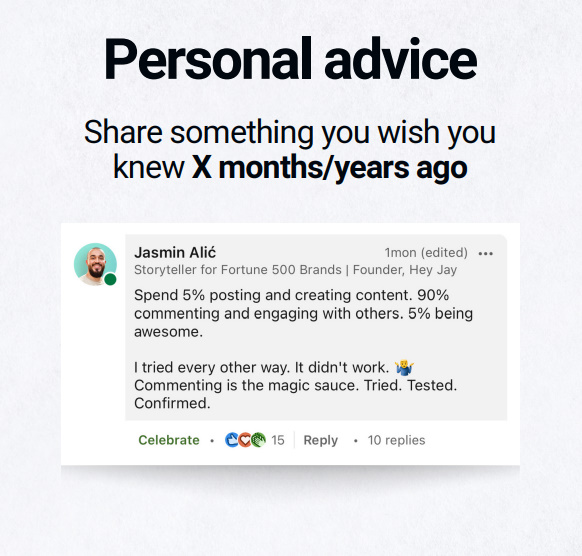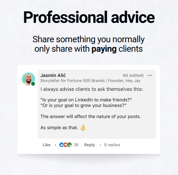 Jasmin doesn't just know LI because he is a pro user. He has an understanding of both the platform and how it is viewed and used that goes well beyond his deep experience. He provides clear strategies and actions for everything from your Profile to how youshow up through Posts.